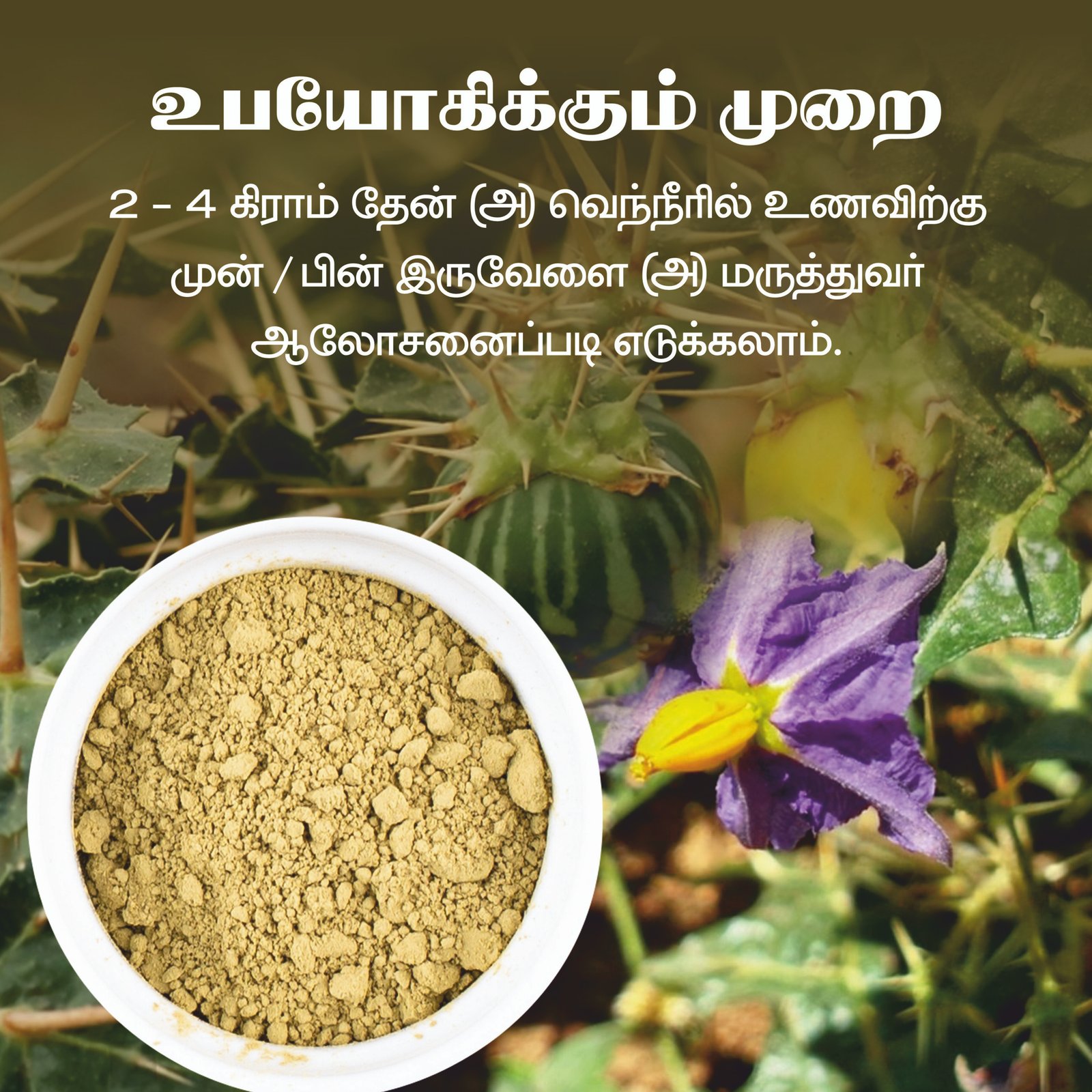 Kandankathiri Powder is prepared from கண்டங்காத்திரி (Solanum xanthocarpum), a powerful herb in Siddha and Ayurveda. It is highly effective for asthma, cough, cold, bronchitis, fever, and digestive problems.