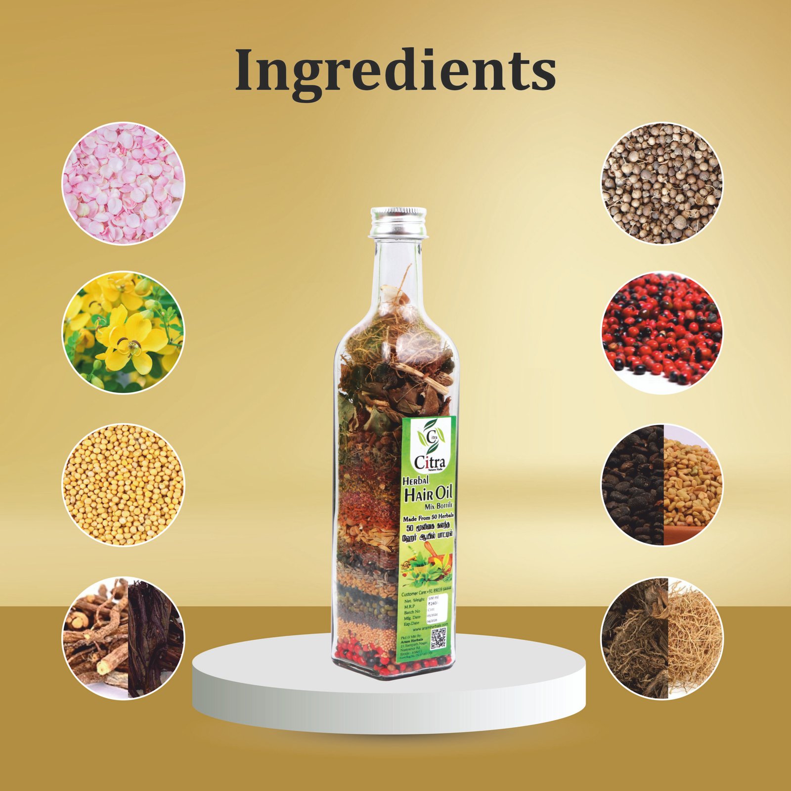 Bhringraj, Amla, Neem, Hibiscus, Coconut Oil, and other herbal extracts